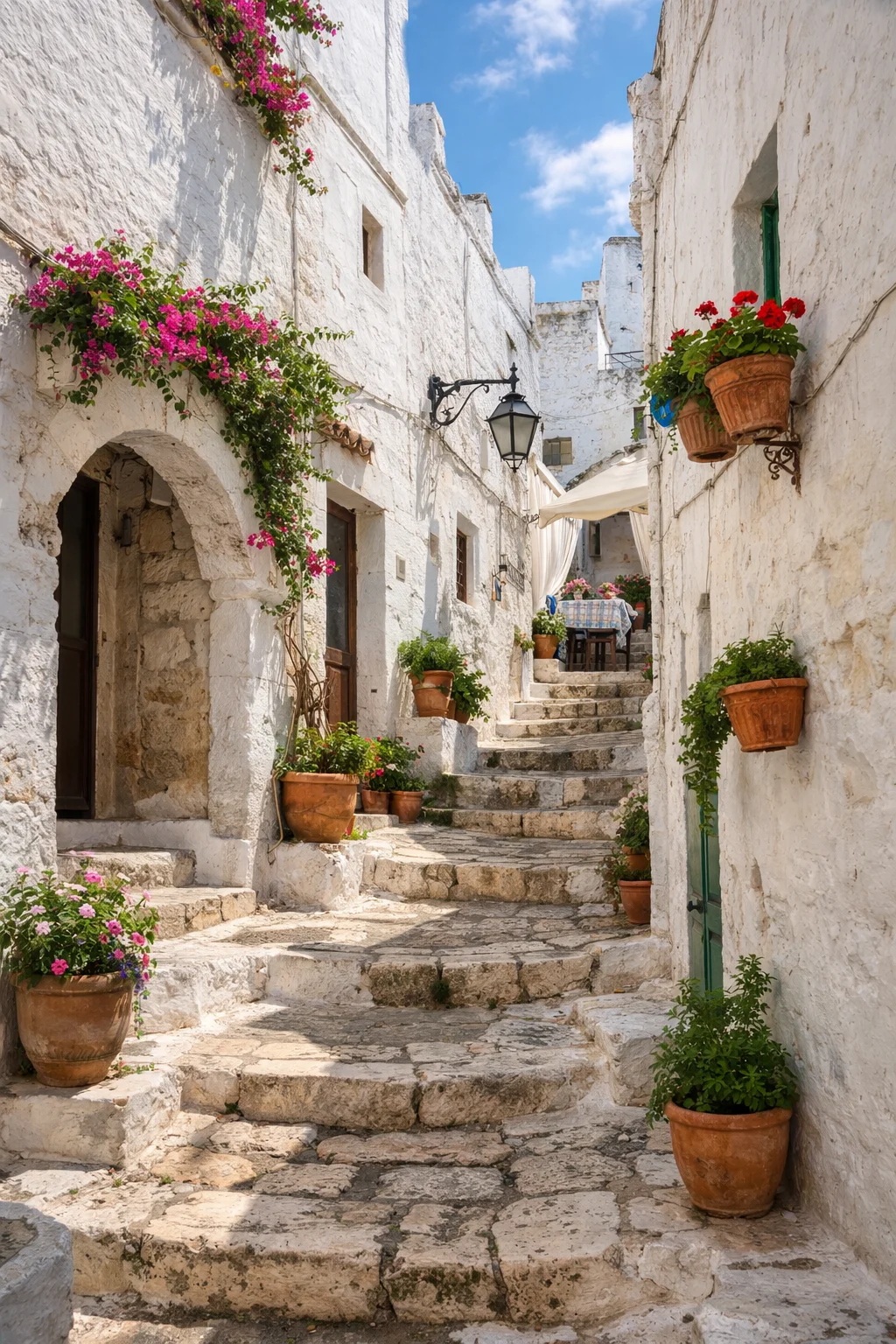 Ostuni si scopre camminando. I vicoli del centro antico salgono verso la Cattedrale attraverso scalinate, archi e passaggi che si aprono su scorci improvvisi. Piazza della Liberta, la Porta Blu, le botteghe artigiane: ogni angolo ha la sua storia.